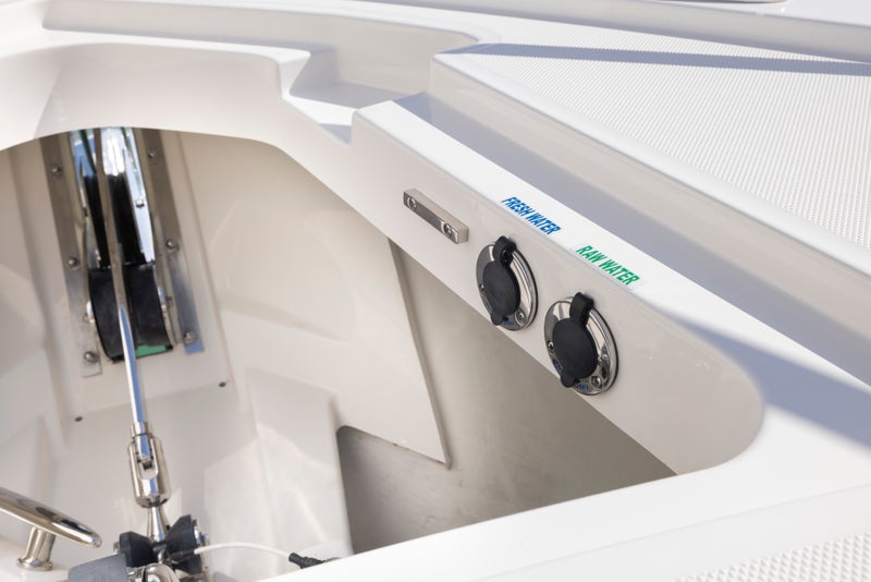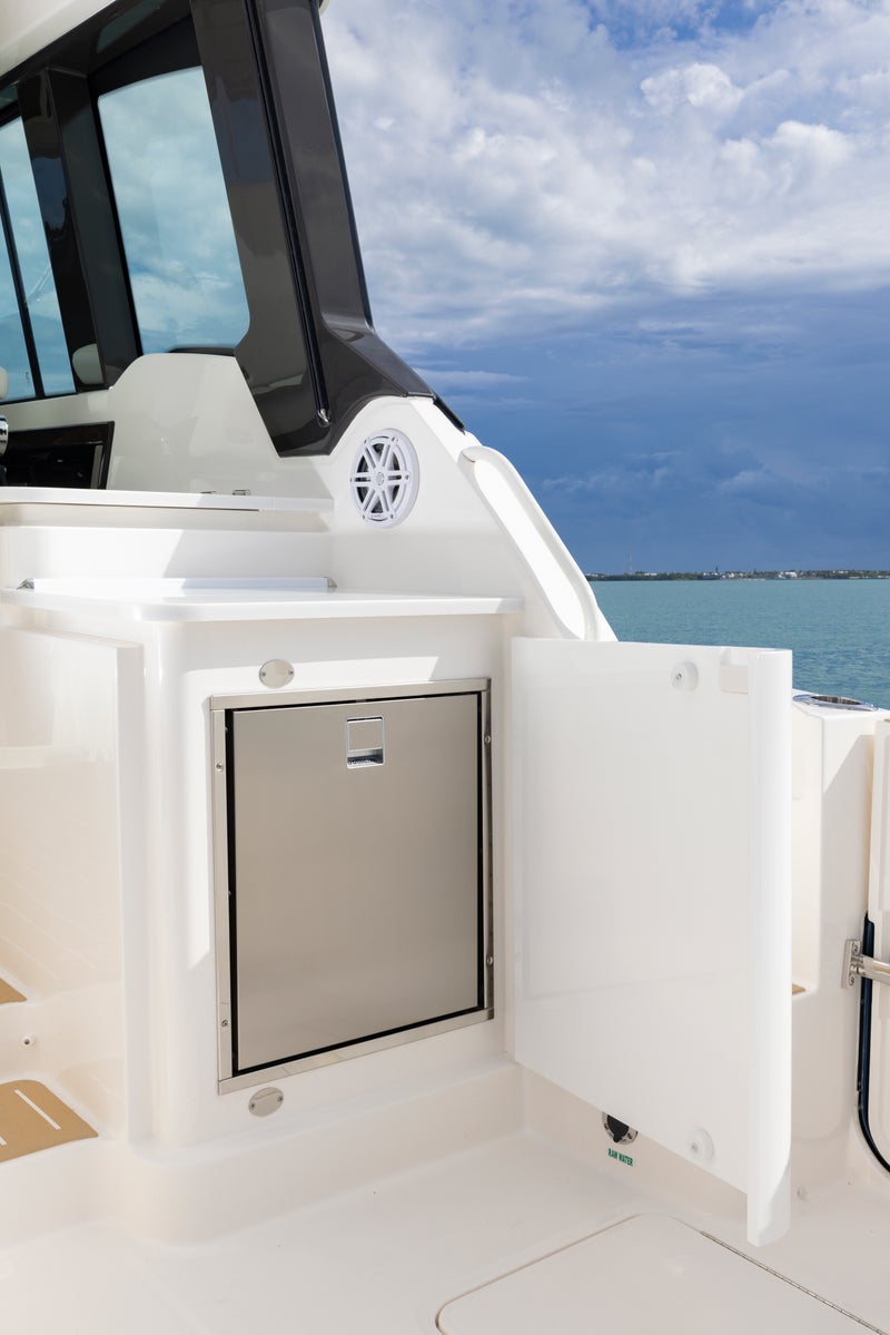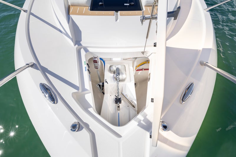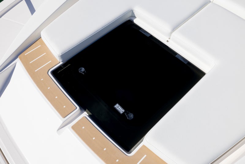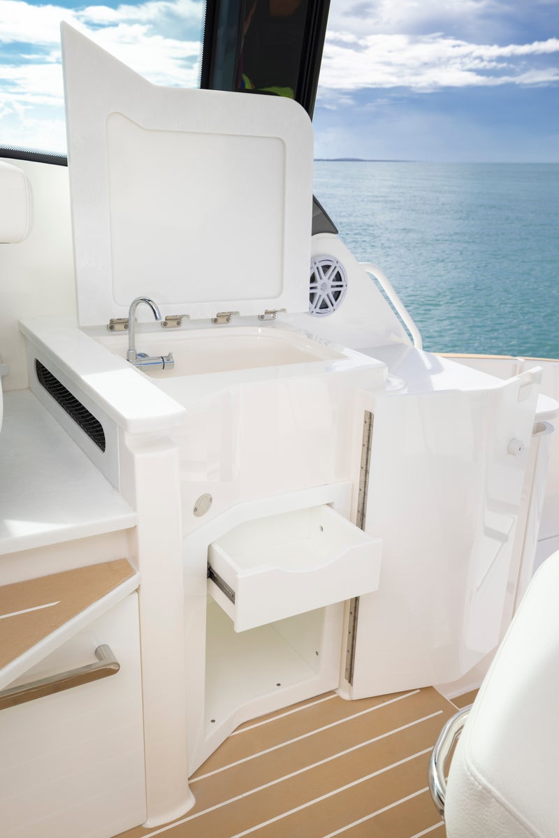 The galley is thoughtfully positioned below to enhance the social space above deck. Outfitted with a sink, microwave, cooktop, and premium amenities, the space is designed to support effortless entertaining. Two well-appointed sleeping quarters offer comfort on longer cruises and a three-zone head complete the space.