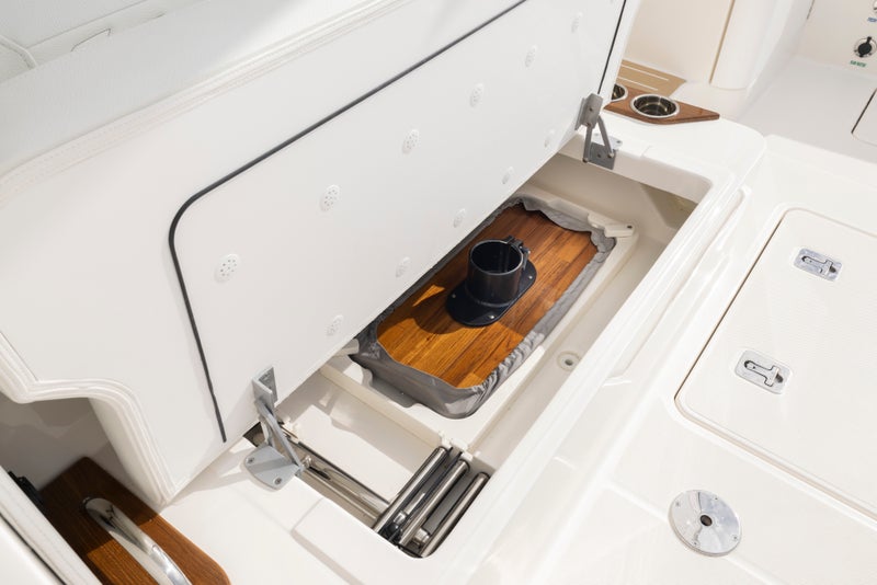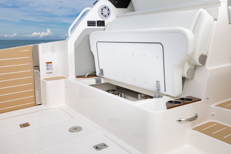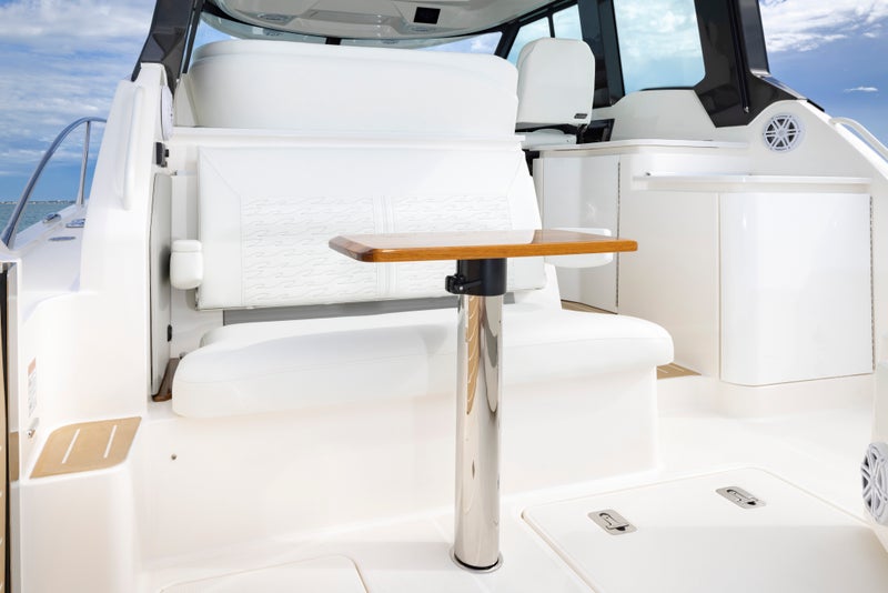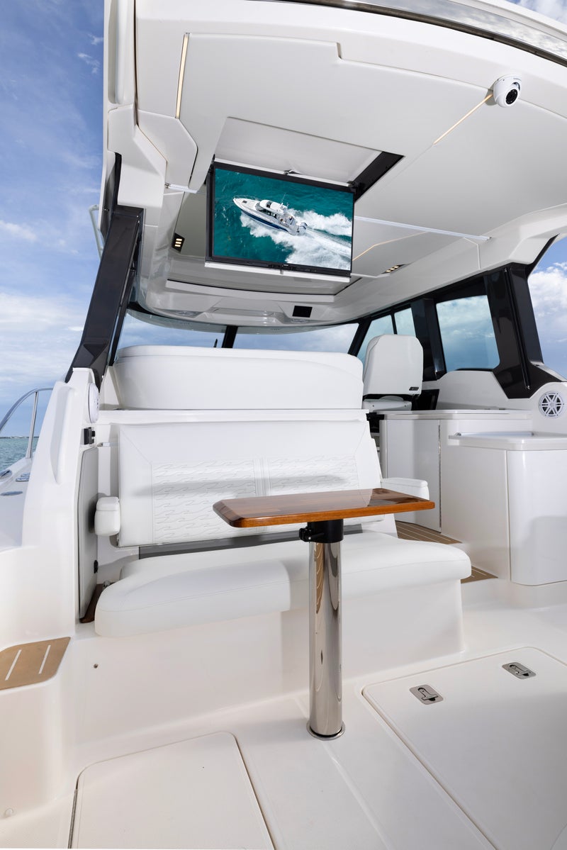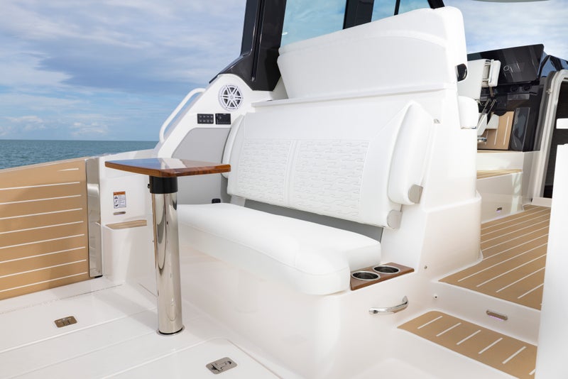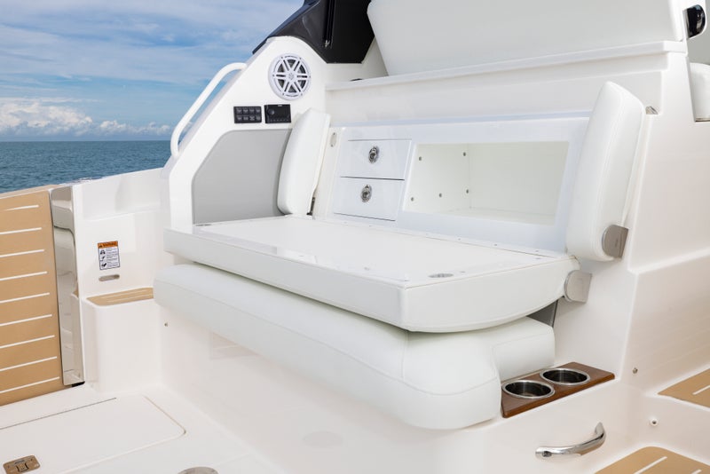 Featuring a salon social zone with versatile seating, the helm seat rotates inward while the companion seat adjusts to form a comfortable L-shaped lounge, ideal for entertaining. The aft cockpit offers a customizable experience, featuring your choice of the Buffet Lounge or the Adventure modules. The aft facing cockpit seat with storage complements either module.