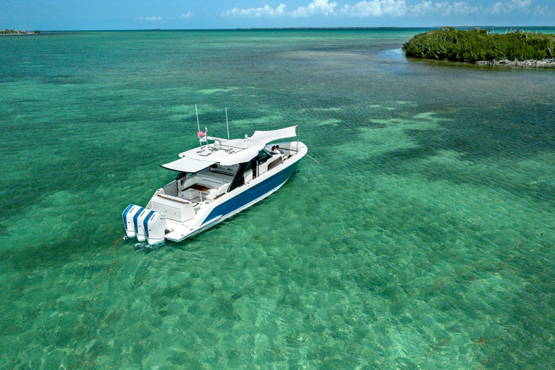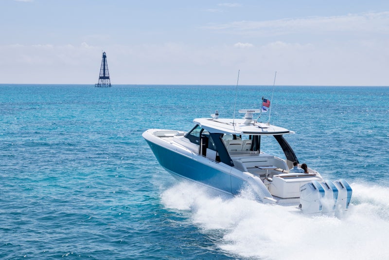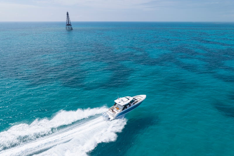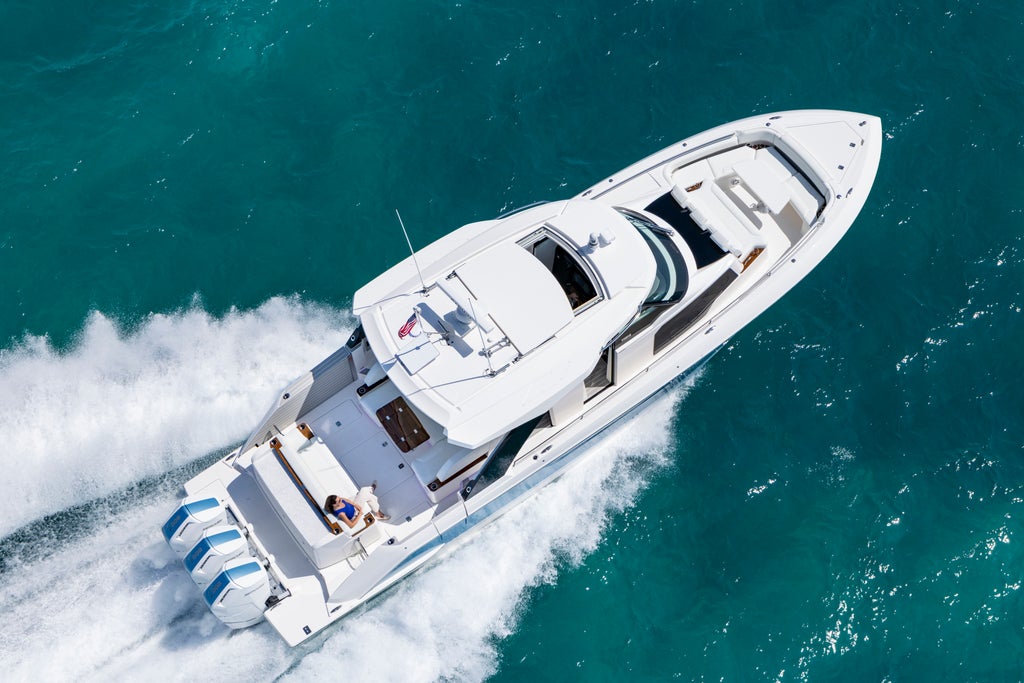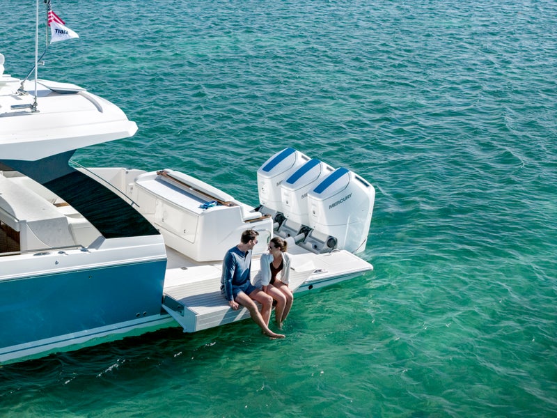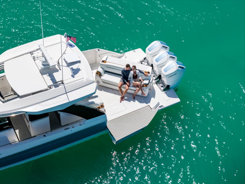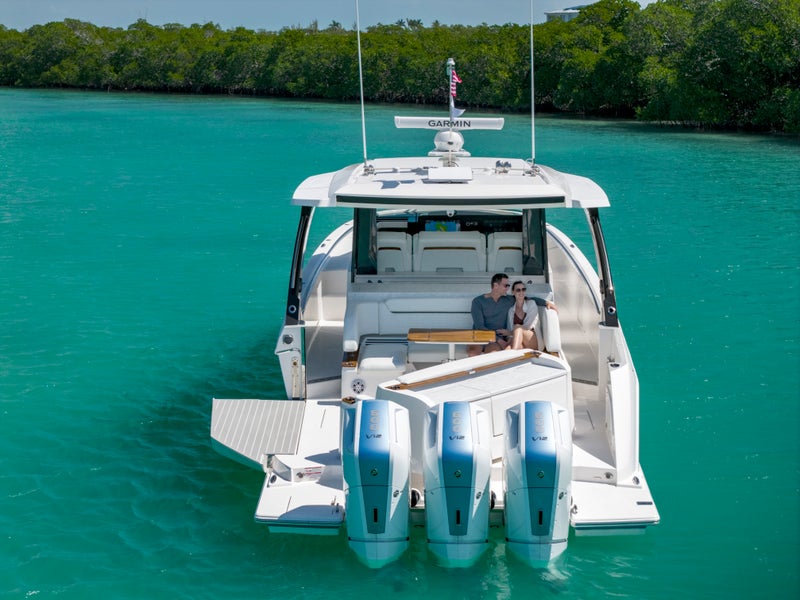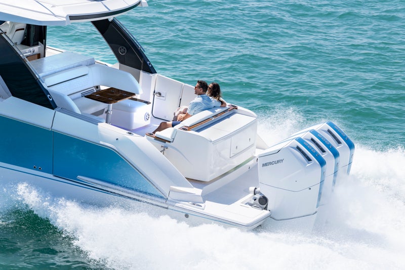 Triple Mercury 600 V12 Verado® outboard engines power the 46 LS with integrated Garmin® Marine navigation systems and joystick piloting. The helm features twin Garmin touchscreen displays, seamlessly integrated with the EmpirBus digital switching system for intuitive and streamlined operation.